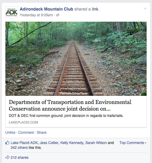 For example, the blog “DOT and DEC Announce Joint Decision on Rails/Trail” on lakeplacid.com was distributed via the Lake Placid ADK Facebook page. That post garnered 30,700 impressions, 4,200 clicks, 352 likes/comments/shares.