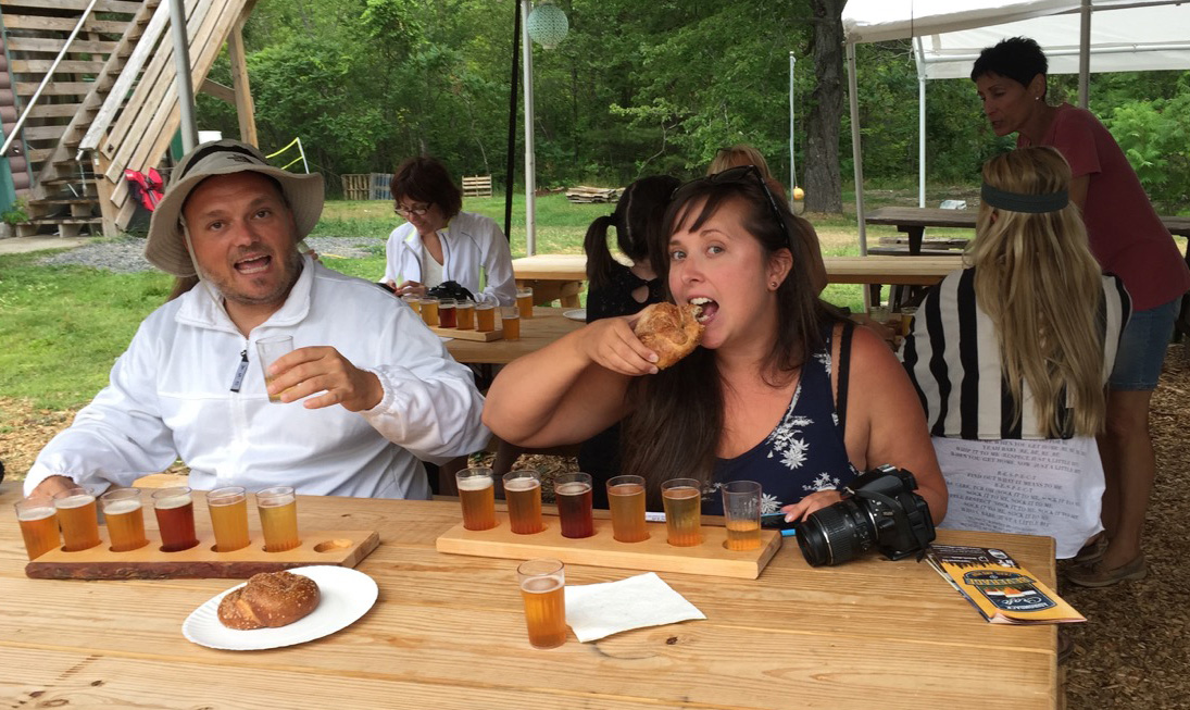Bloggers trying out a flight of Paradox Brewery beer and pretzels in Schroon Lake.