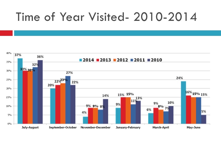 - Peaks summer (July/August), followed by early summer (May/June) were the highest reported times of visitation. Reported winter visitation (November/December and January/February) dropped considerably from 2013 levels. This may be attributable to poor stretches of weather for winter sports.