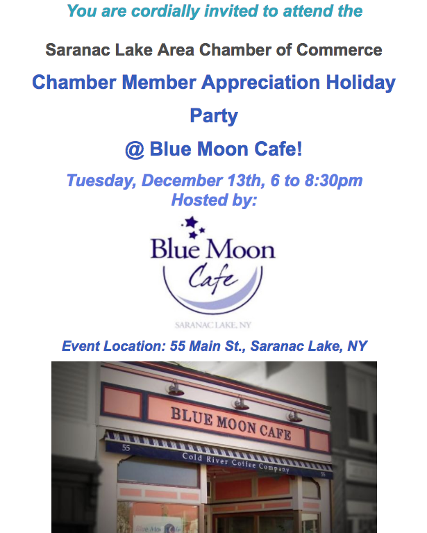 Don't miss live music, Saranac Lake Area Chamber of Commerce membership updates, Blue Moon Cafe's speciality hors d'oeuvres, and other fun surprises.