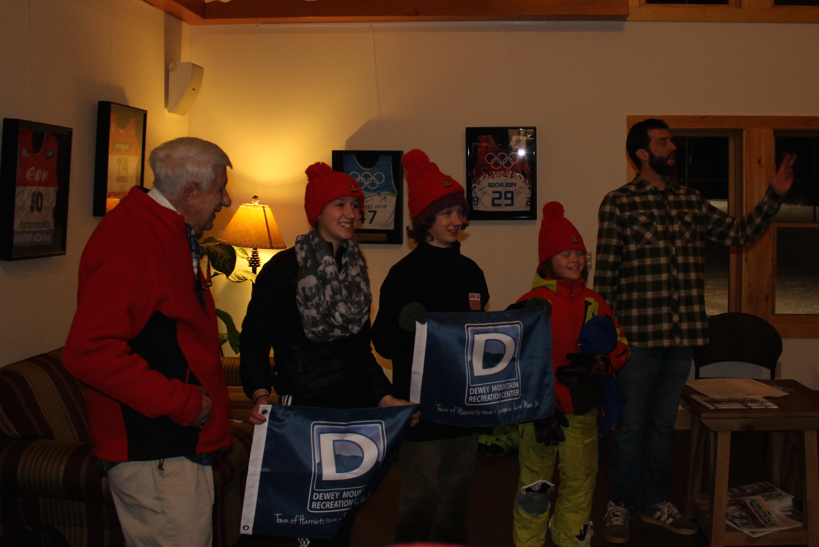 Dewey Mountain Manager Jason Smith gave Kaylen Reiley, 12, a Mount Pisgah hoodie and he gave Adrian Hayden, 12, and Sylvie Linck, 13, Dewey Mountain flags to represent where they learned their sport. He also gave them each a Dewey hat.