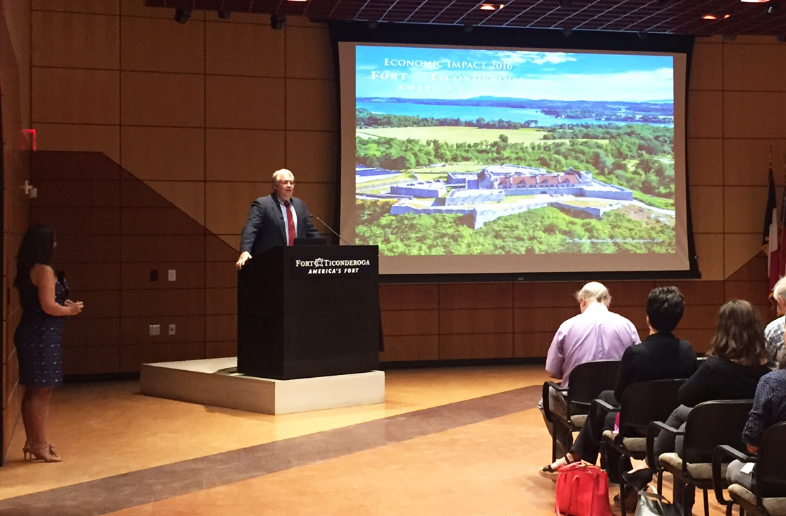 The economic impact announcement made today at Fort Ticonderoga’s Mars Education Center was celebrated by regional and state officials, as well as local and regional business leaders, regional non-profit leaders, and tourism representatives. Featured speakers at the major announcement included New York Assemblyman Dan Stec and James McKenna, President and CEO of the Regional Office of Sustainable Tourism. Also in attendance was Joe Giordano, Ticonderoga Town Supervisor; Matthew Courtright, Executive Director of the Ticonderoga Area Chamber of Commerce; Sanford W. Morhouse, Fort Ticonderoga Association Chairman of the Board; and Beth Hill, Fort Ticonderoga Association President and CEO.