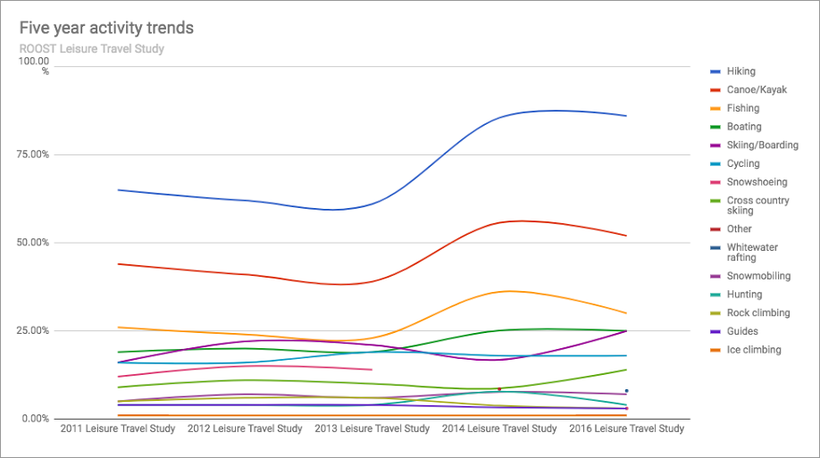 The chart below shows the percent of each outdoor activity in the ROOST leisure travel study respondents reported participating in since 2011. The rise in hiking and paddling correlate with an increase in ROOST’s efforts to market these activities.