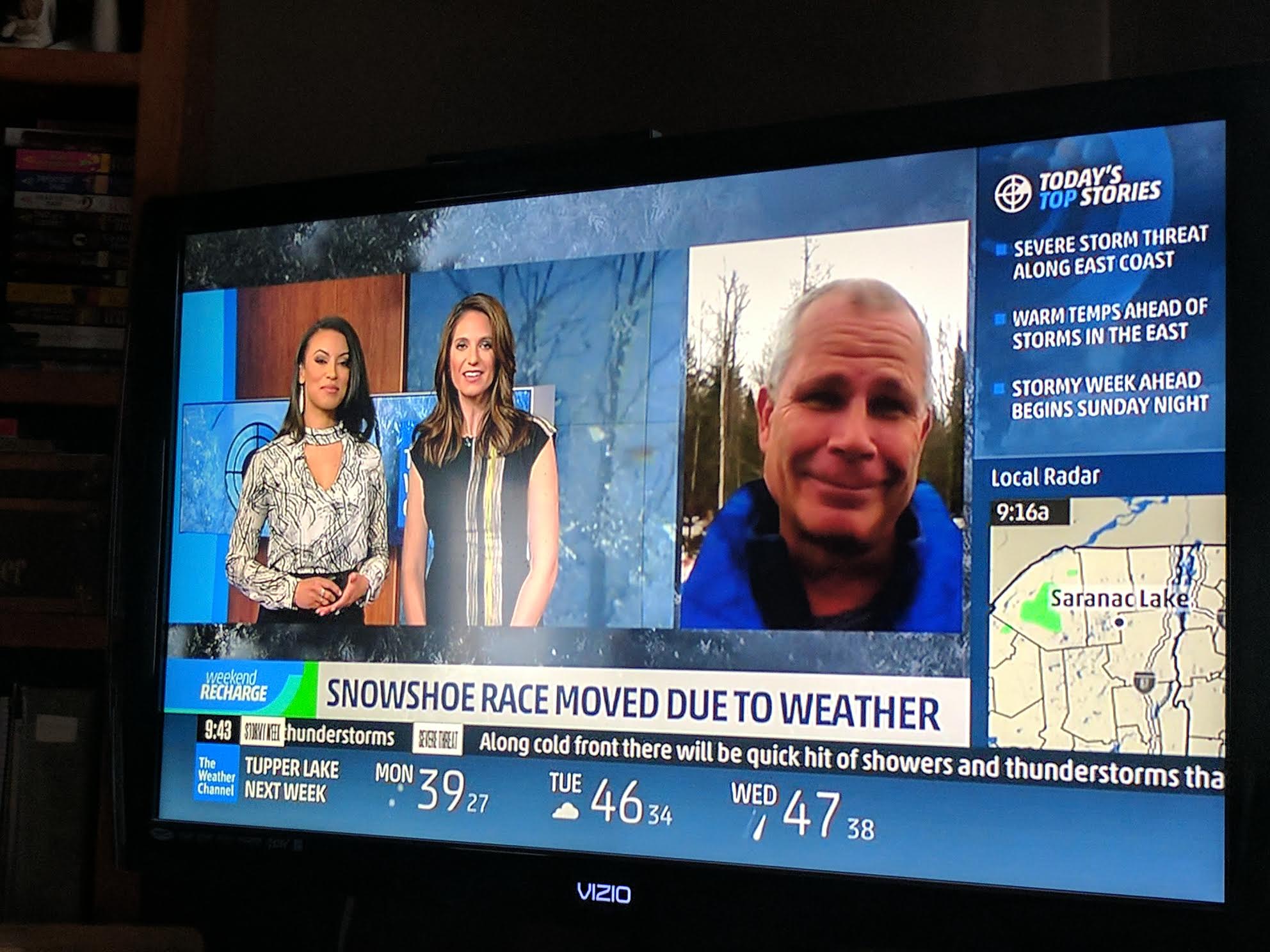 February, 2017: The Weather Channel interviewed Saranac Lake Mayor Clyde Rabideau live via Skype as part of a feature on the World Snowshoe Championships held February 25th. The interview was conducted at 8 a.m. the day of the event and focused on the unseasonably warm weather and the 50-plus volunteers on hand to shovel snow onto the race course.