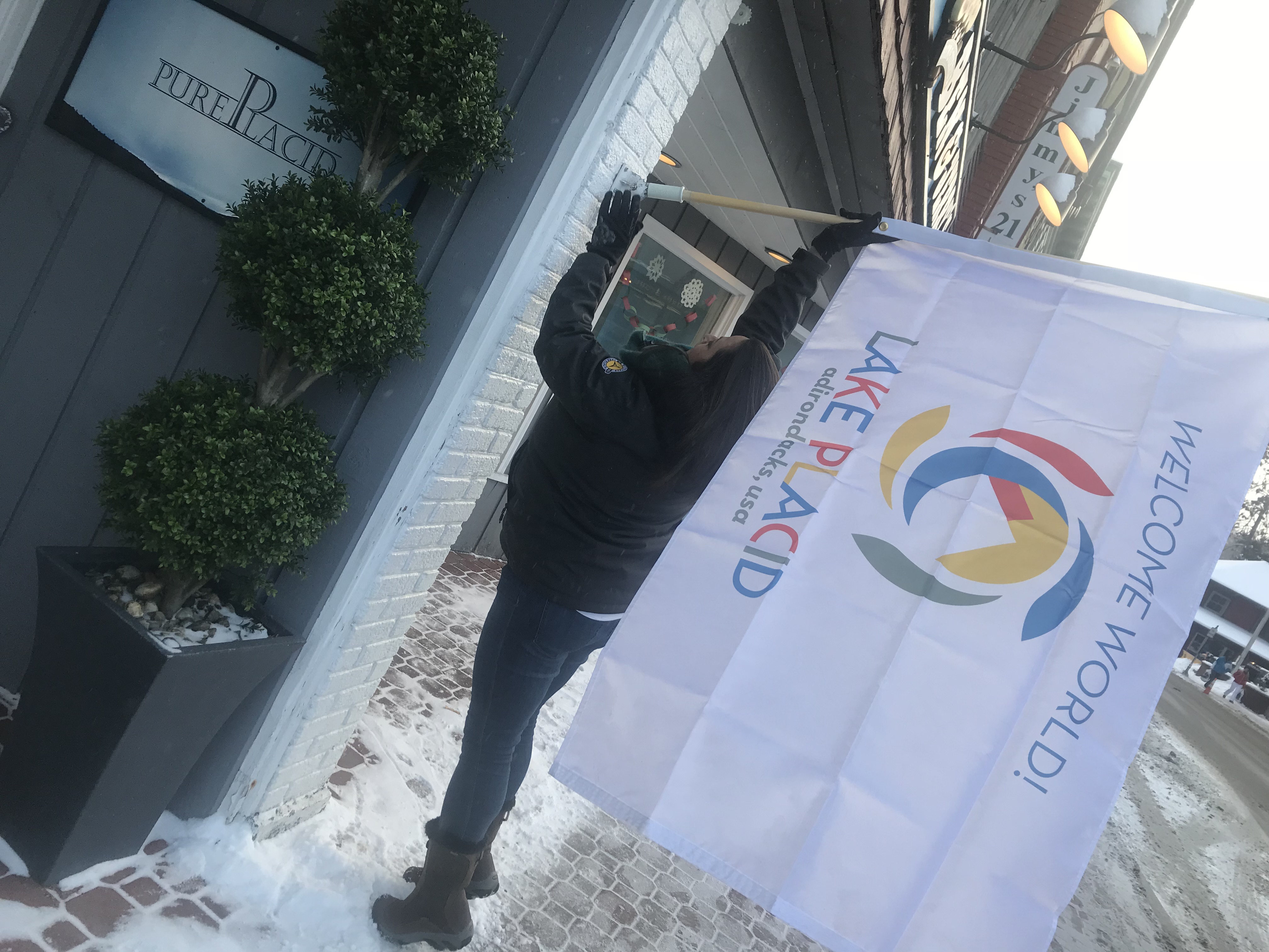 As a way to help welcome guests and visitors to Lake Placid this winter, when we will be hosting several World Cups and other major competitions and events, ROOST designed "Welcome World" flags that are available complimentary to business owners.
