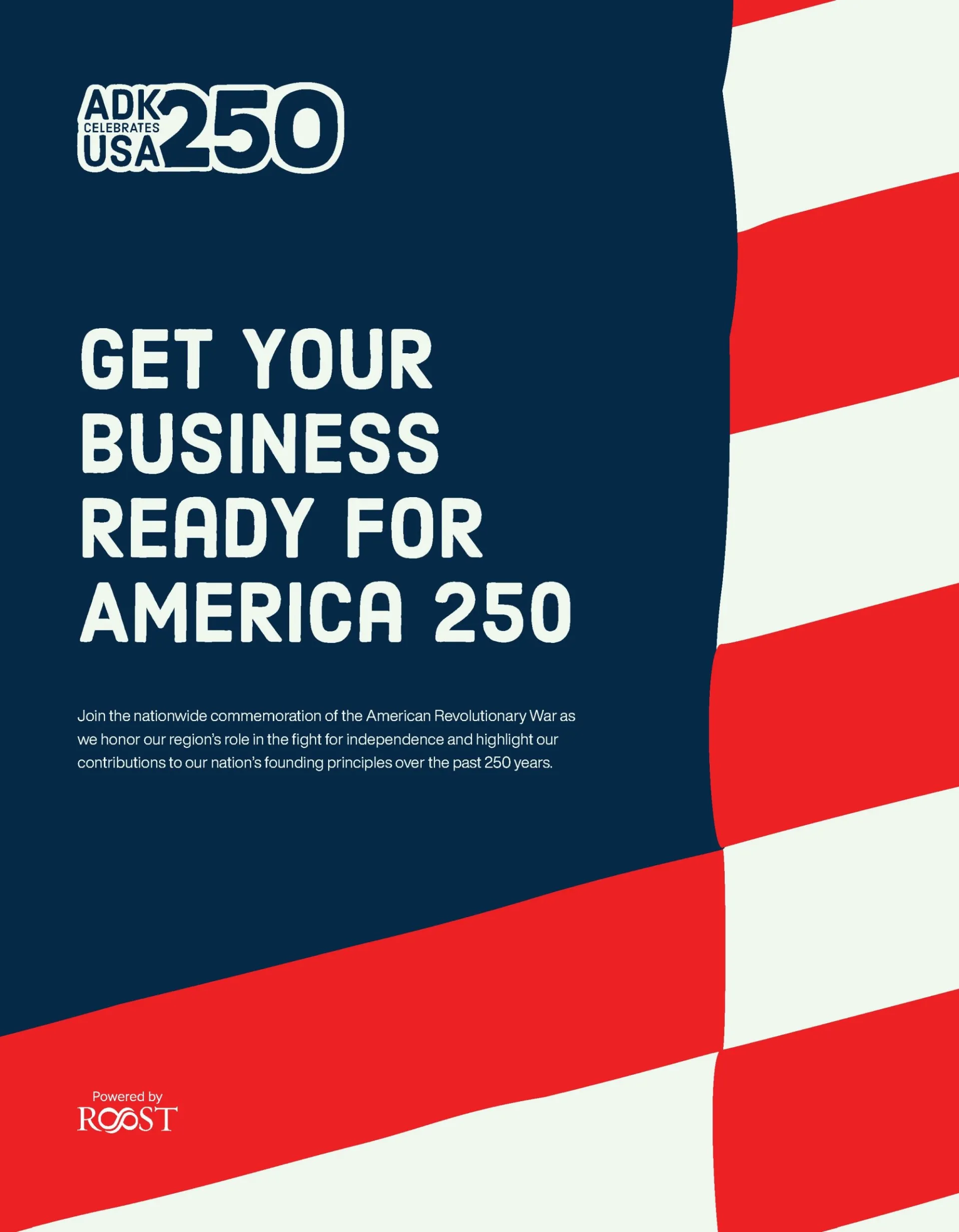 ROOST’s region-wide initiative, ADK Celebrates USA 250, unites the Adirondacks to maximize our collective impact for America 250. This branding, created to promote the region during the semiquincentennial, is available for businesses and communities to adopt. Using a consistent, recognizable brand helps amplify our message and build a strong regional identity.